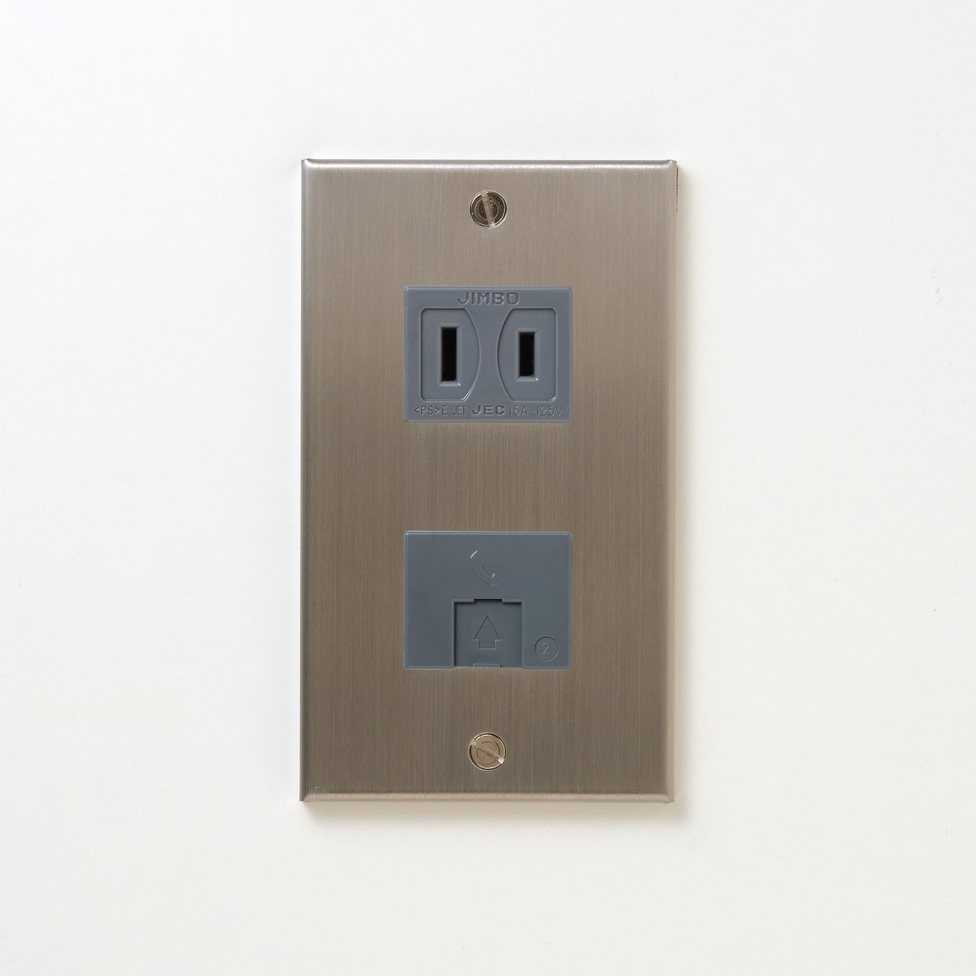 ステンレス(ヘアライン) プレート<br>+ NK 埋込モジュラジャック6極2心 グレー <br>+ NK 埋込コンセント グレー