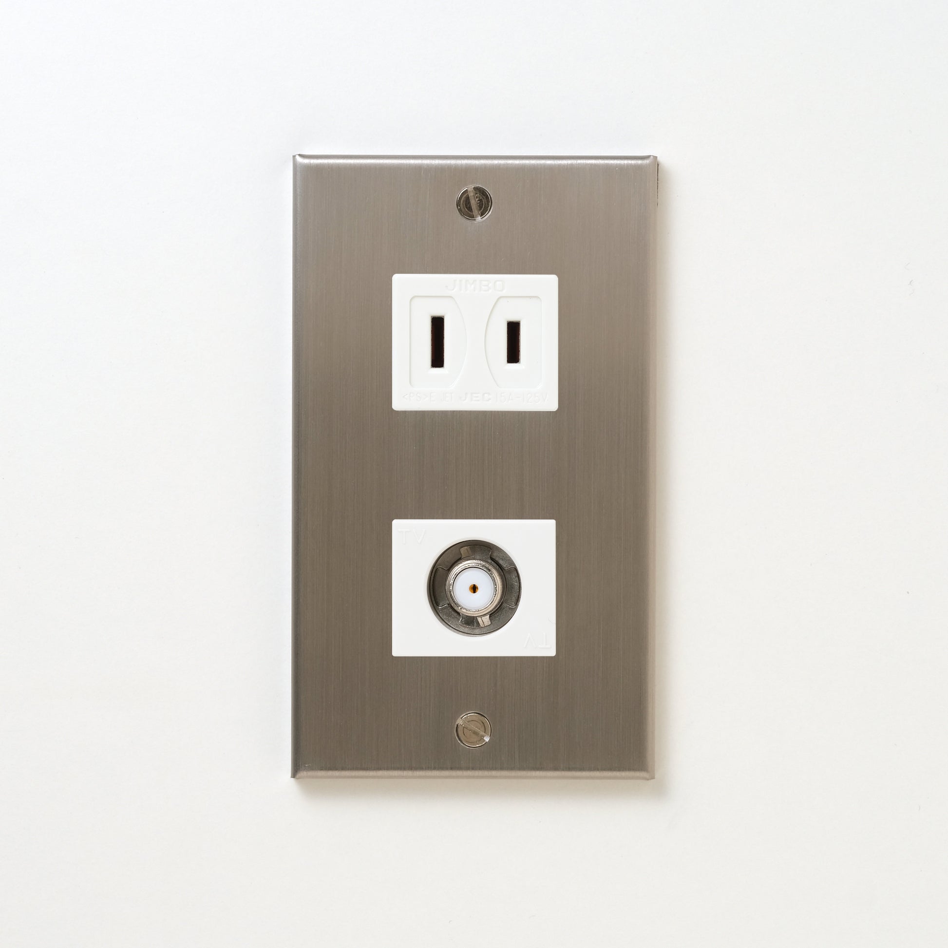 ステンレス(ヘアライン) プレート<br>+ NK 新4K8K衛星放送対応 埋込小型高シールドテレビ端子 ホワイト <br>+ NK 埋込コンセント ホワイト