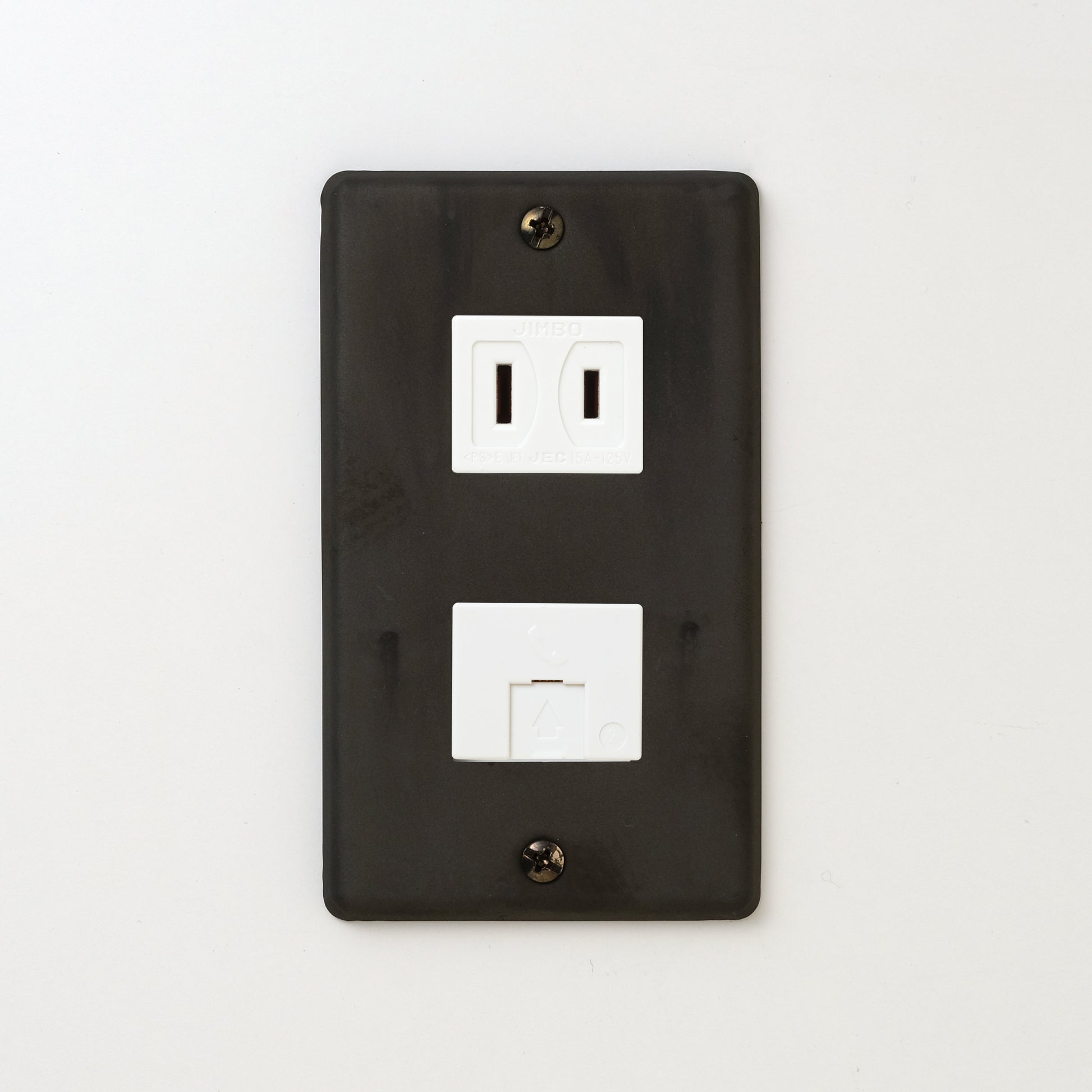 ステンレス(黒染)プレート<br>+ NK 埋込モジュラジャック6極2心 ホワイト <br>+ NK 埋込コンセント ホワイト