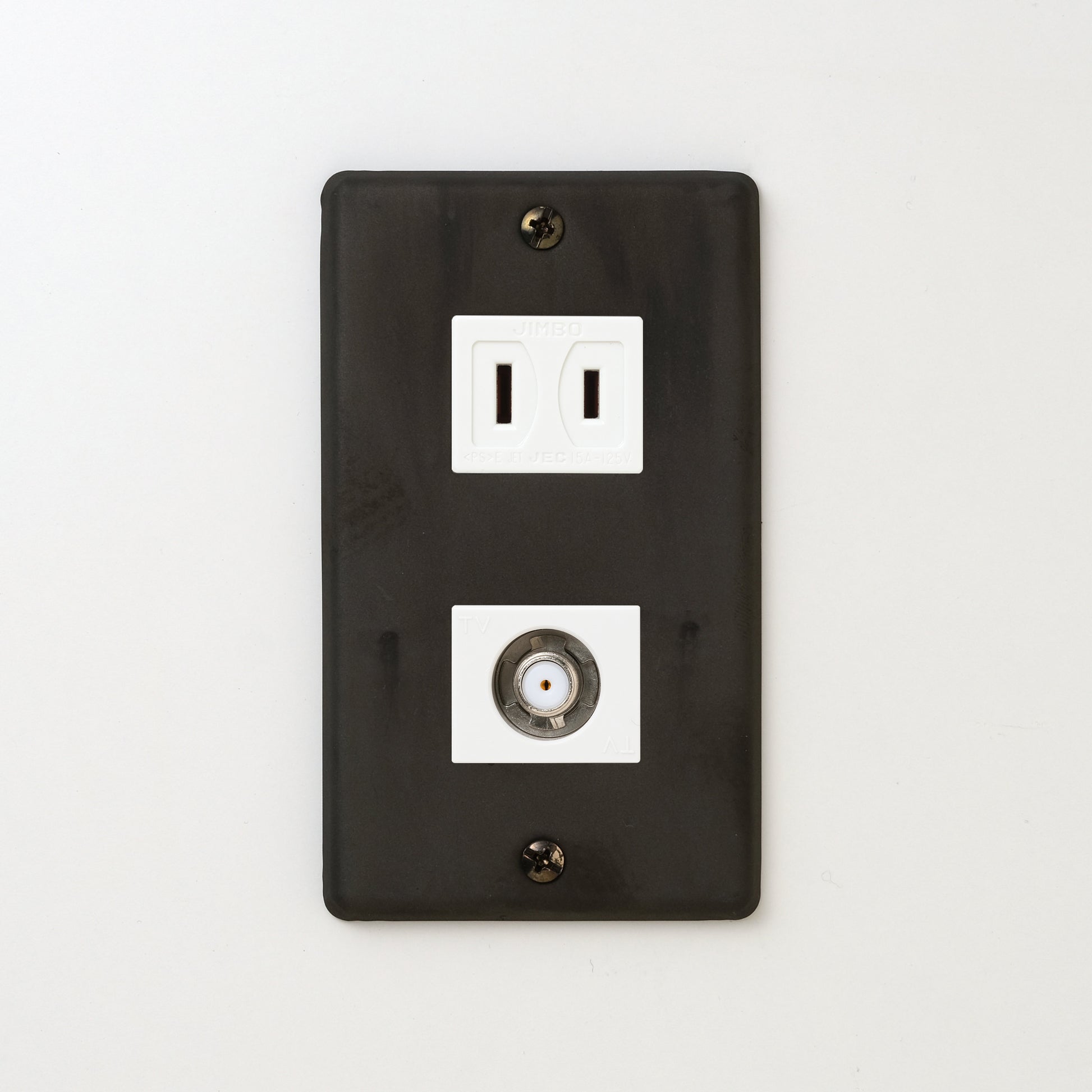 ステンレス(黒染)プレート<br>+ NK 新4K8K衛星放送対応 埋込小型高シールドテレビ端子 ホワイト <br>+ NK 埋込コンセント ホワイト