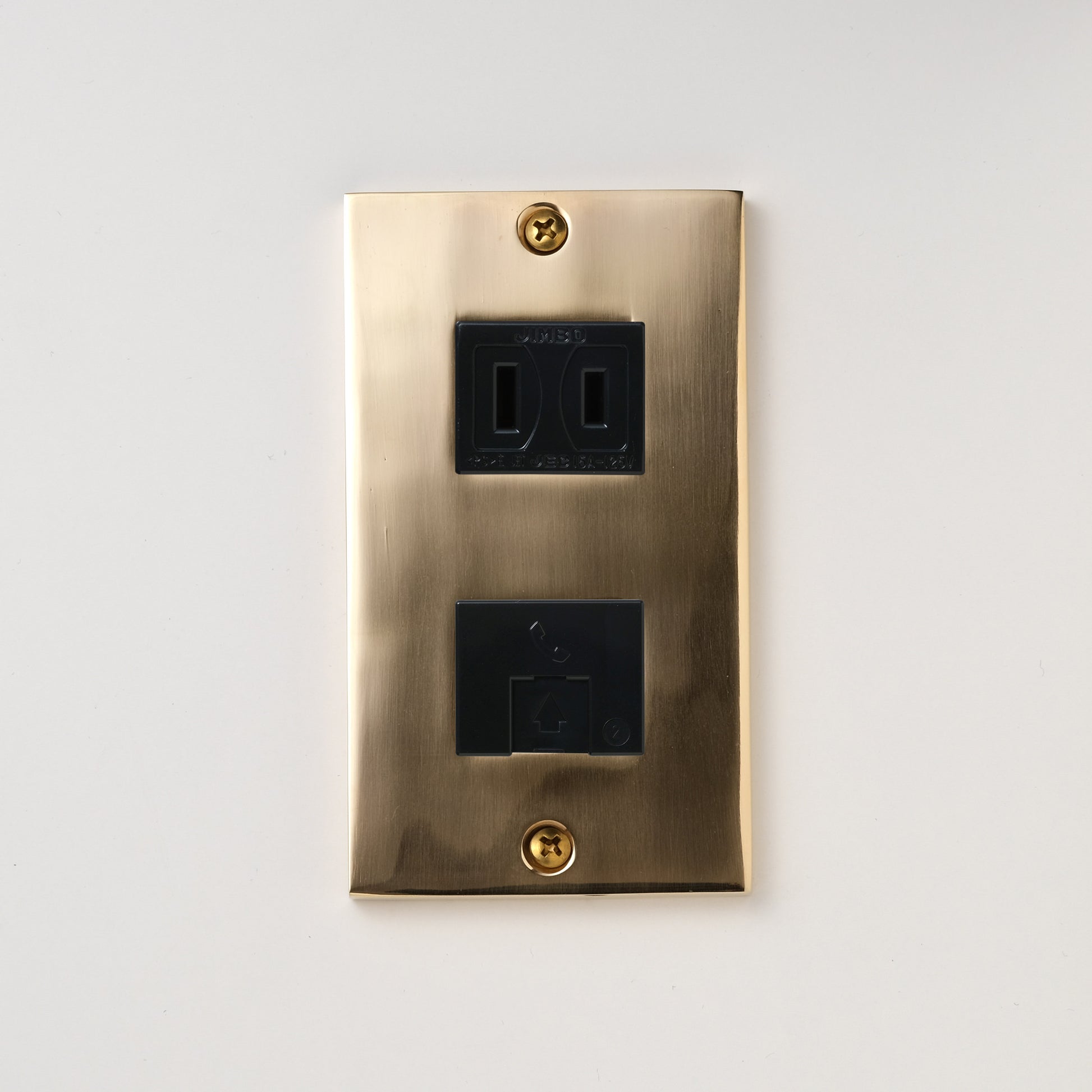 真鍮砂型鋳造(磨き)プレート<br>+ NK 埋込モジュラジャック6極2心 ブラック <br>+ NK 埋込コンセント ブラック