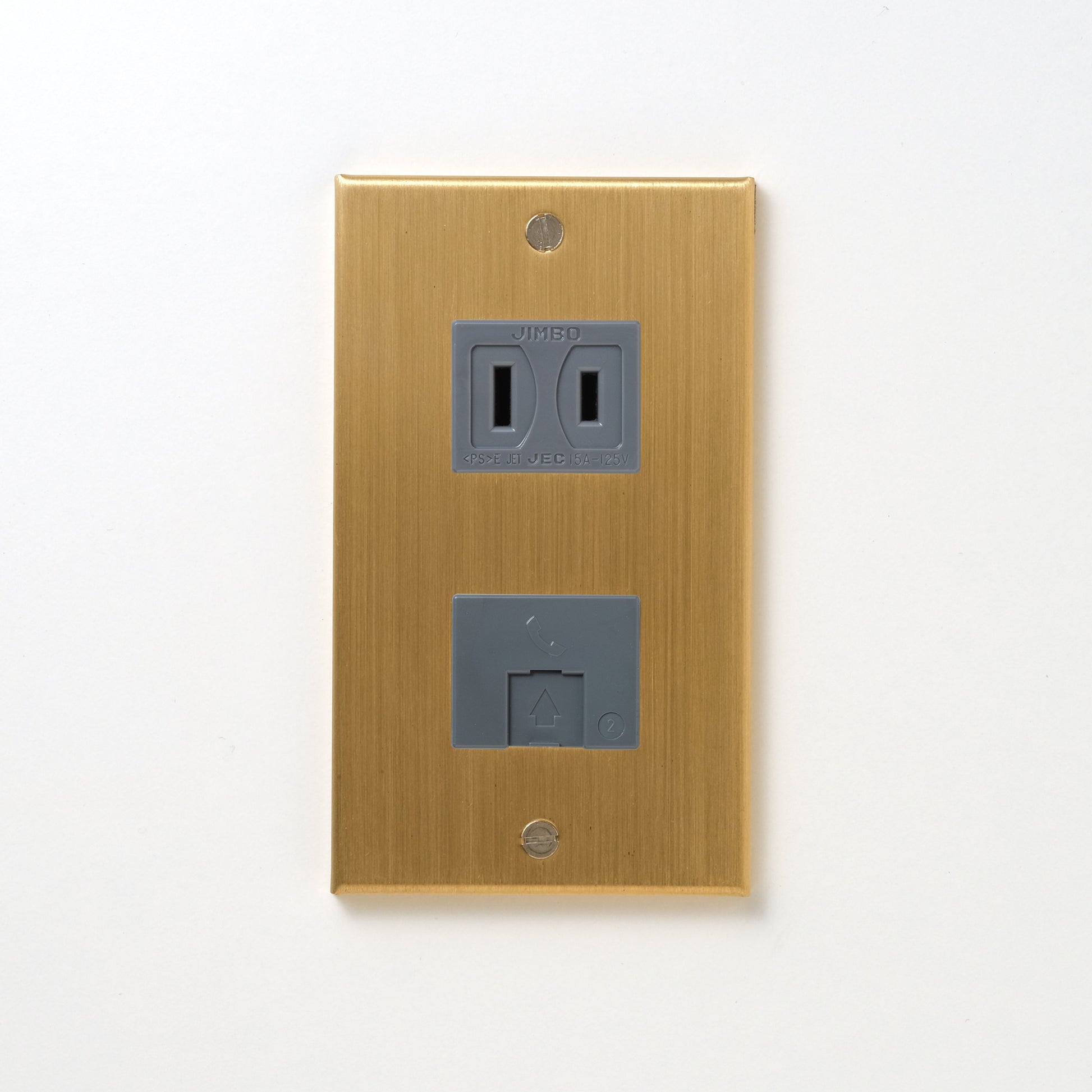 真鍮(ヘアライン) プレート<br>+ NK 埋込モジュラジャック6極2心 グレー <br>+ NK 埋込コンセント グレー