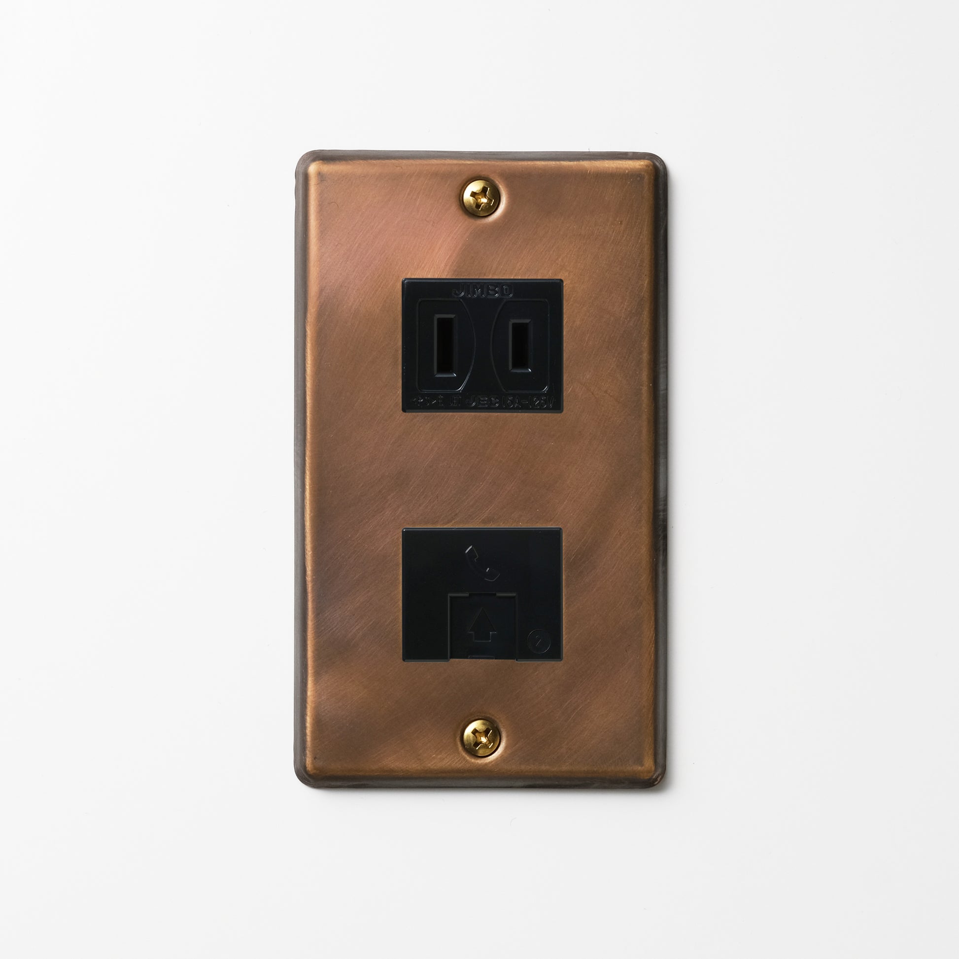 真鍮(燻し) プレート<br>+ NK 埋込モジュラジャック6極2心 ブラック <br>+ NK 埋込コンセント ブラック