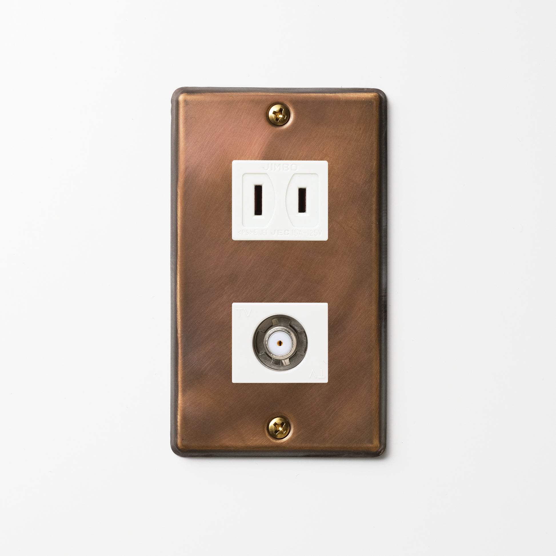 真鍮(燻し) プレート<br>+ NK 新4K8K衛星放送対応 埋込小型高シールドテレビ端子 ホワイト <br>+ NK 埋込コンセント ホワイト