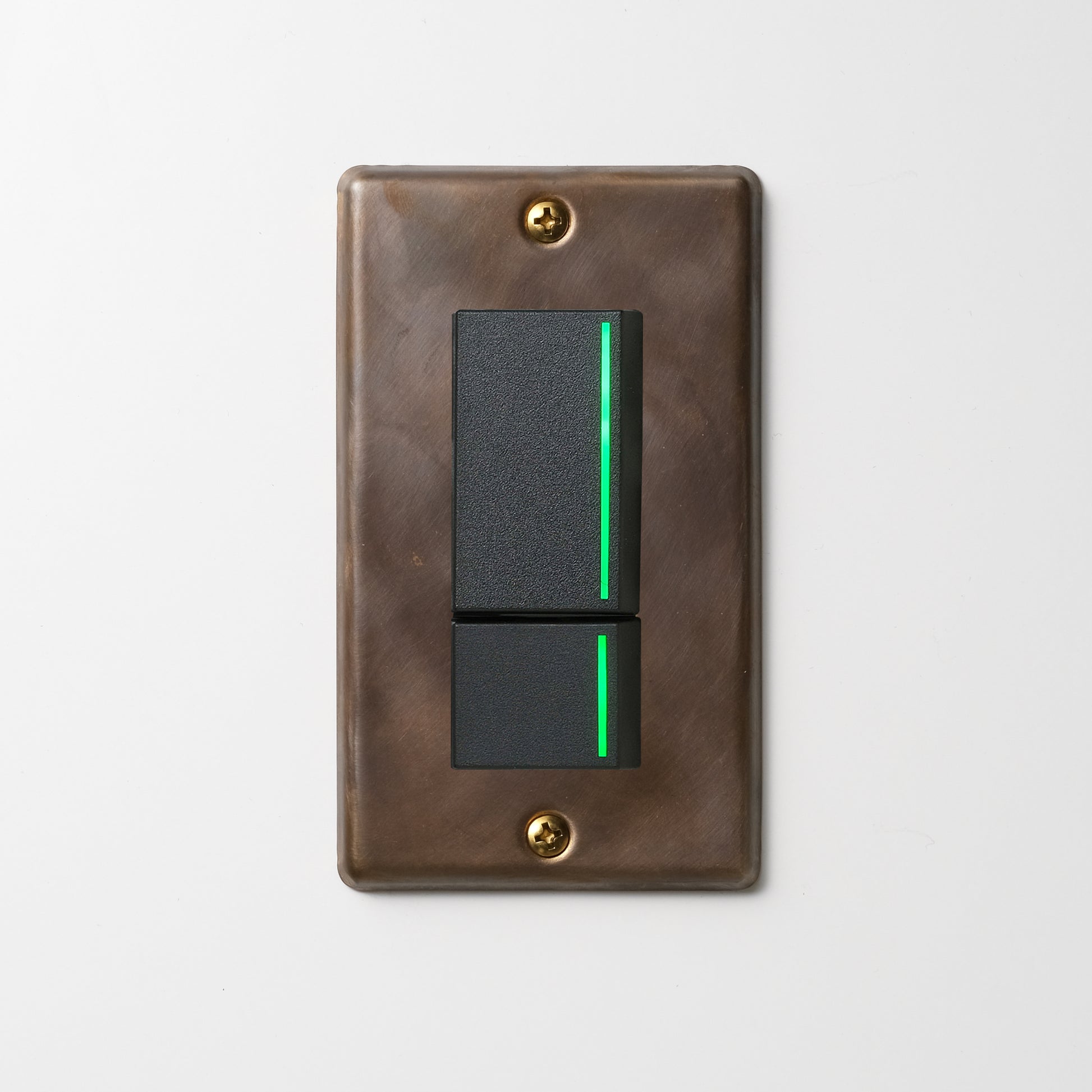 真鍮(燻し) プレート <br>+ NK 片切、3路ガイドランプ(グリーン)スイッチダブル(上段大)  ブラック