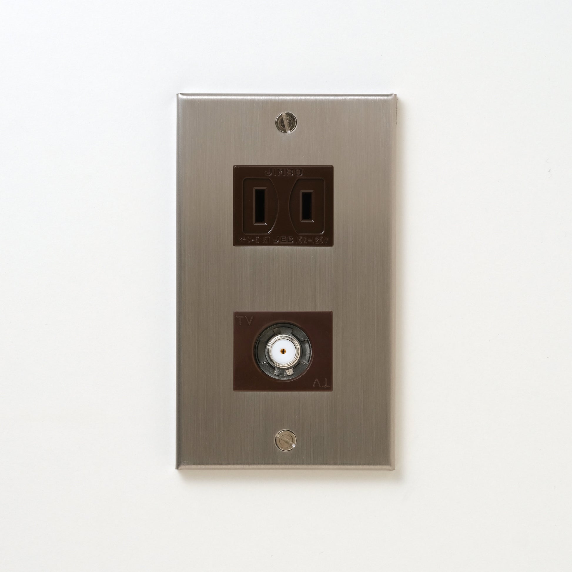 ステンレス(ヘアライン) プレート<br>+ NK 新4K8K衛星放送対応 埋込小型高シールドテレビ端子 チョコ <br>+ NK 埋込コンセント チョコ